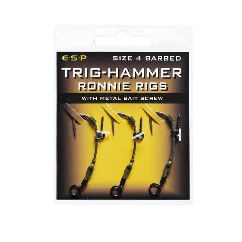 Montajes de anzuelos para carpfishing de la marca ESP de la talla 4, modelo Trig Hammer Ronnie Rig, especial para la pesca de carpfishing.