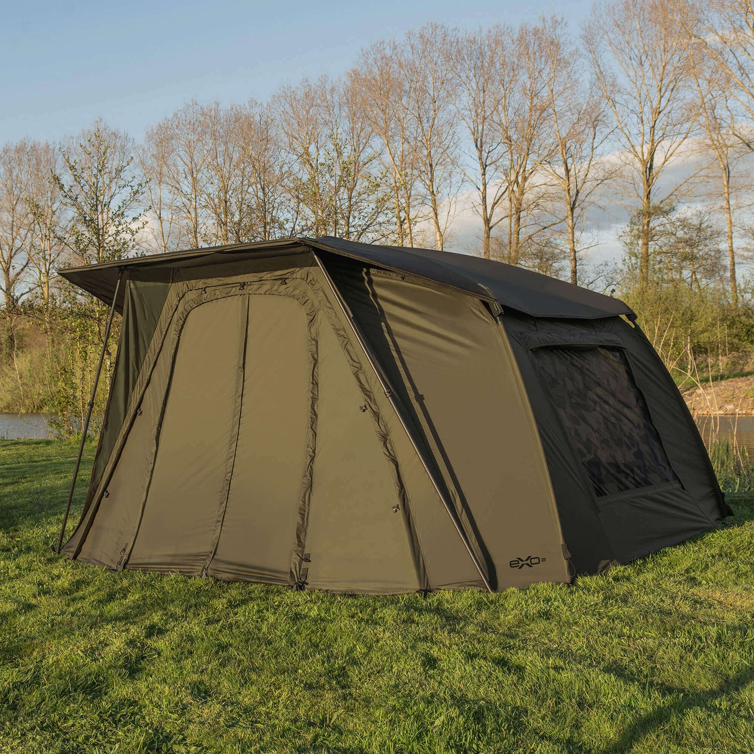 Refugio de la marca Avid Carp, modelo Exo 2 personas, en color kaki, especial para la pesca de carpfishing.