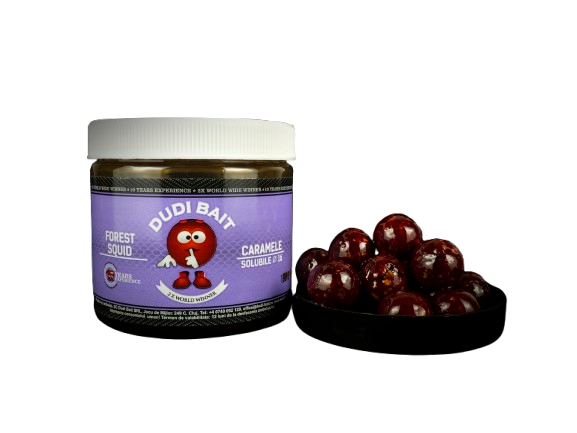 Boilies solubles seleccionados para postura de la marca Dudi Bait de 16 milímetros gama Glugged sabor a calamar forest, especial para la pesca de carpfishing.