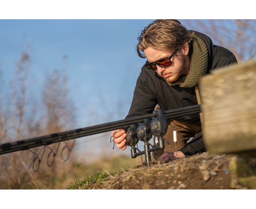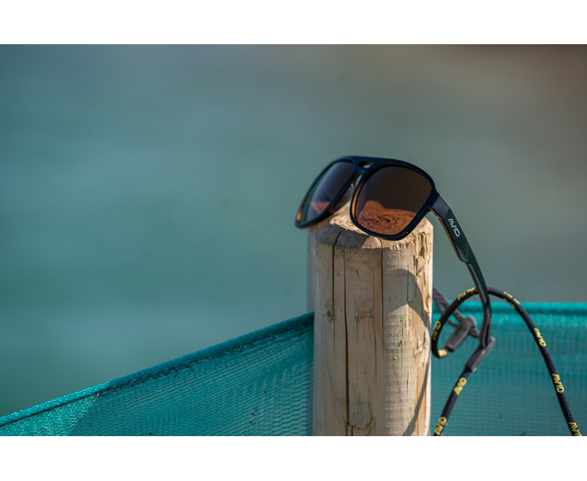 Gafas de sol de la marca Avid Carp, modelo Classic en color negro, con lentes marrones, perfecta para tus sesiones de pesca de carpfishing.