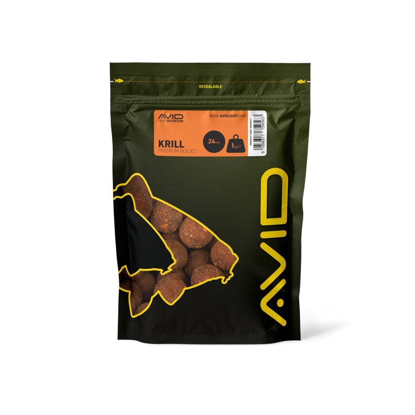 Boilies de la marca Avid Carp, gama Premium, sabor Krill, especial para la pesca de carpfishing.
