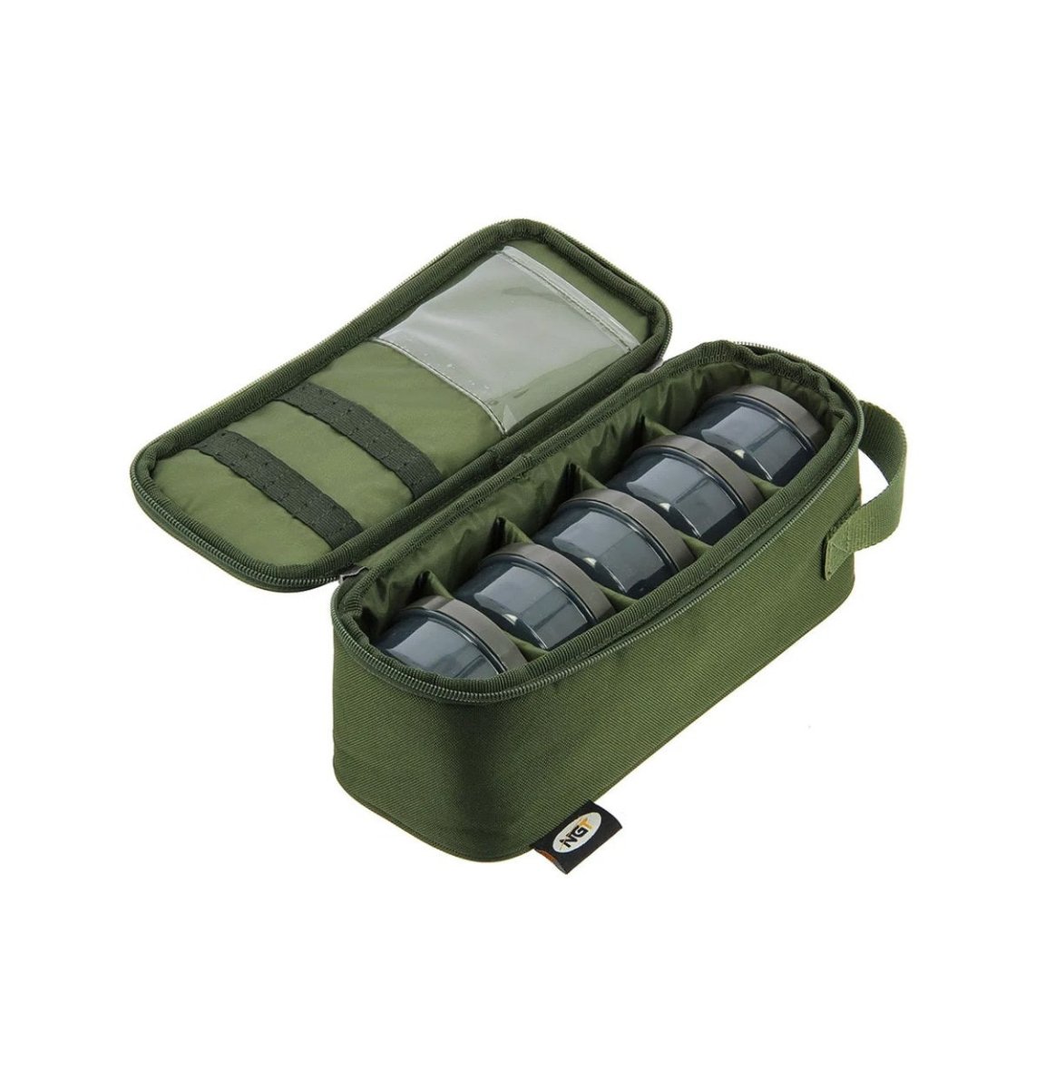 Bolso de cebo de la marca NGT, modelo Deluxe, en color Verde, diseñado para el almacenamiento de cebos, dips y líquidos, especial para la pesca de carpfishing.