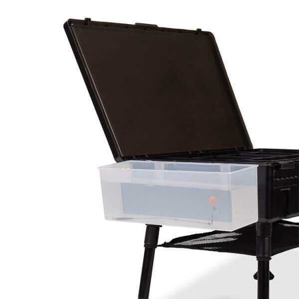 Caja de montaje rígida con mesa de la marca Nash, modelo TT Rig Station, en color gris, especial para la pesca de carpfishing. Caja de aparejos de gran profundidad para almacenar todo lo que necesitas.