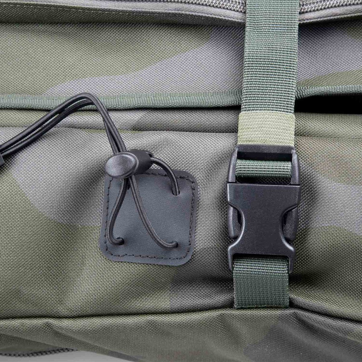 - Bolsillo posterior expandible y correas para accesorios más grandes