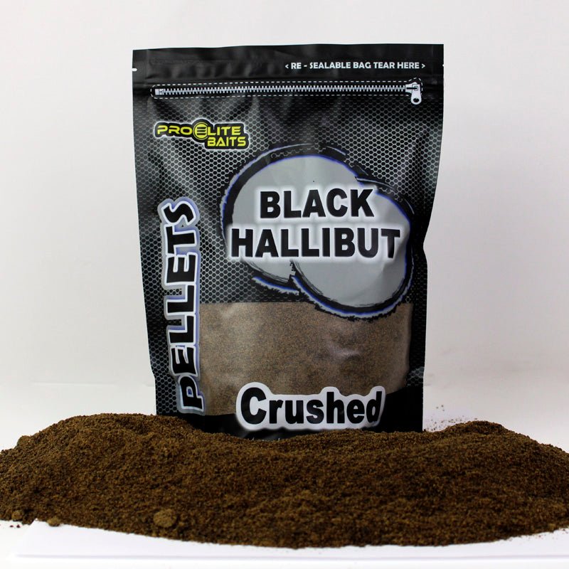 Pellets triturados de la marca Pro Elite Baits sabor Halibut en color negro, especiales para la pesca de carpfishing.