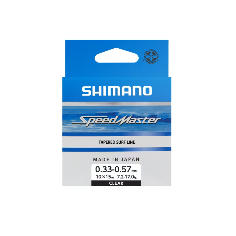 Bobina de la marca Shimano modelo Speedmaster Surf Taper Id de 10 puentes cónicos de 15 metros cada uno en color transparente , especial para la pesca de carpfishing.