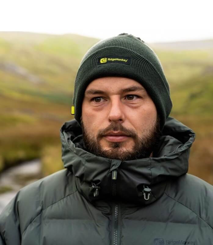 Gorro con bola para invierno de gran calidad de la marca Ridge Monkey en color verde, especial para la pesca de carpfishing.