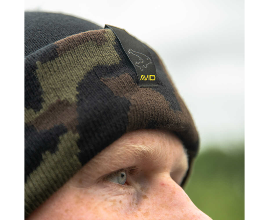 Gorro Beanie de la marca Avid Carp, en color negro y camo, especial para la pesca de carpfishing.