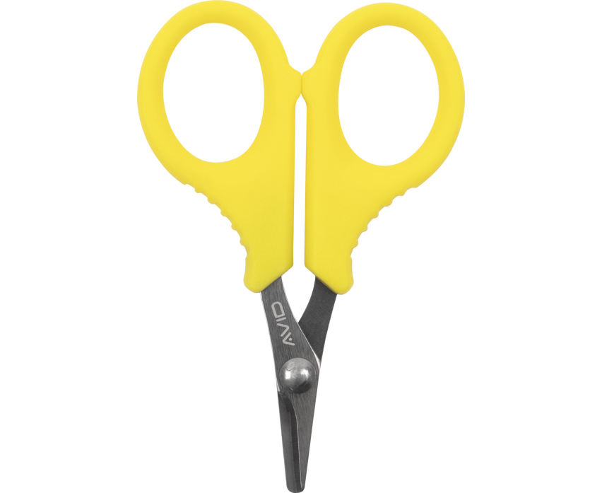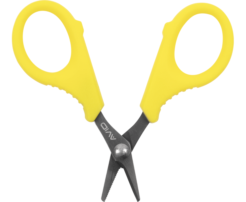 Tijeras de la marca Avid Carp de color amarillo de tamaño compacto para trenzado, especial para la pesca de carpfishing.