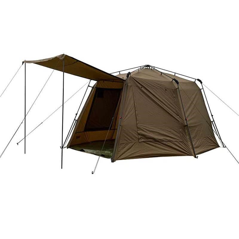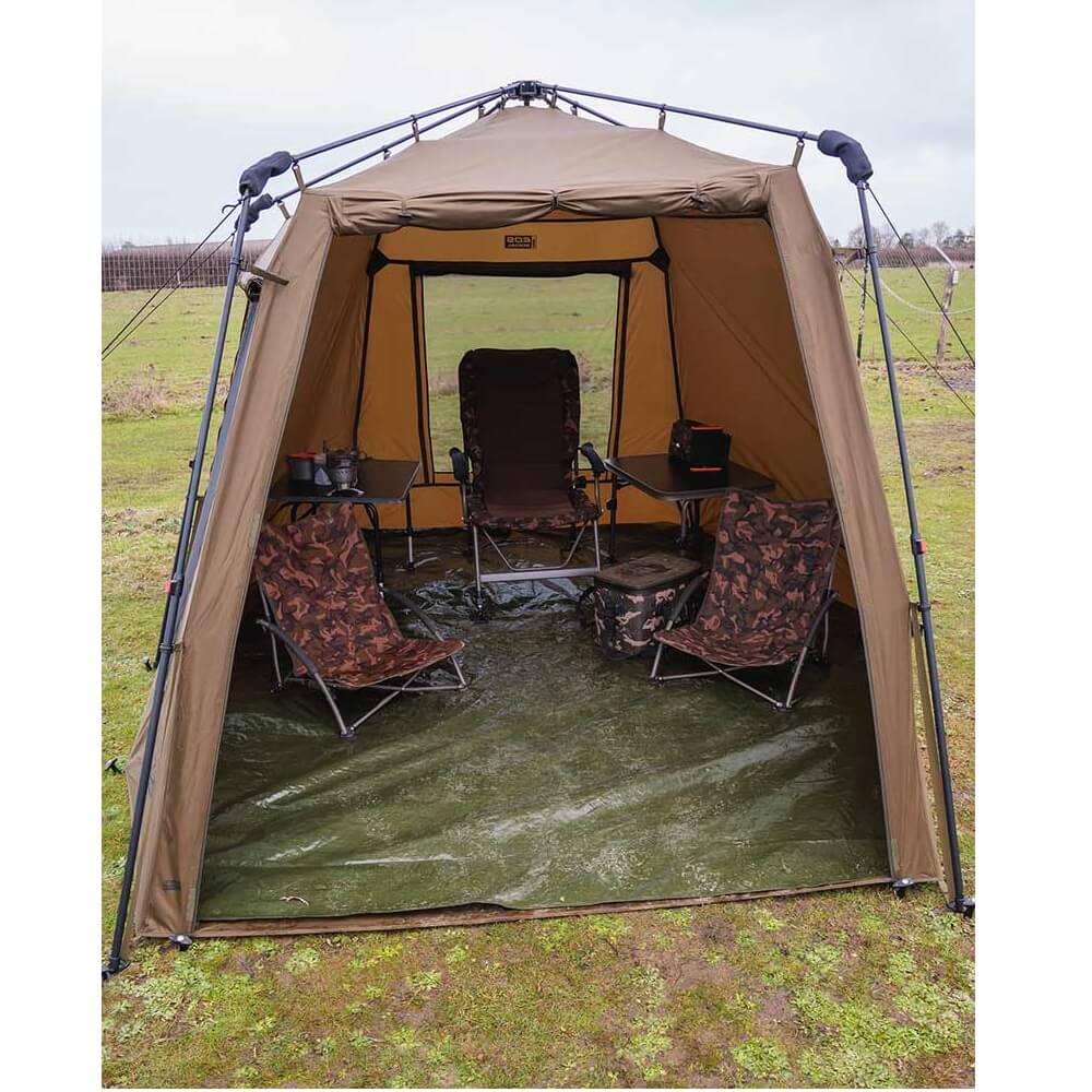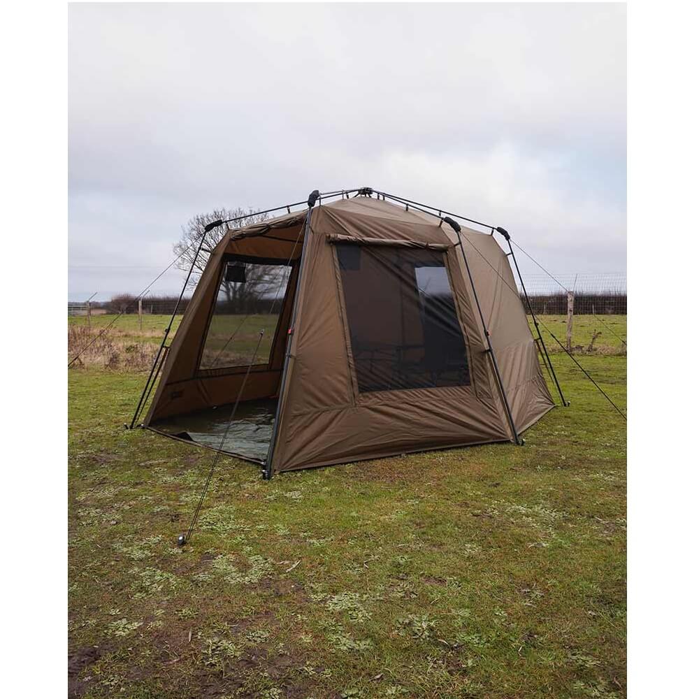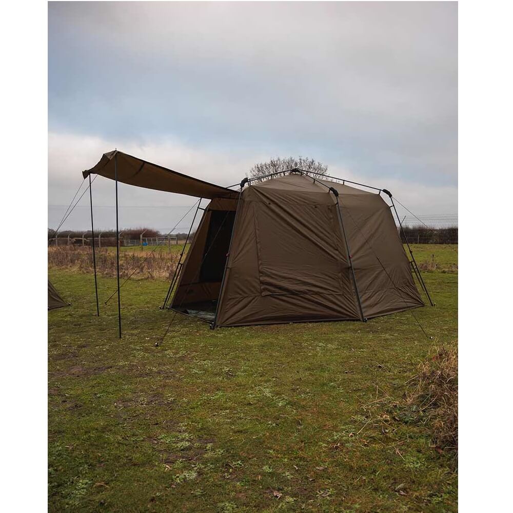 Refugio de la marca Fox modelo EOS Social Shelter en color khaki, especial para la pesca de carpfishing.