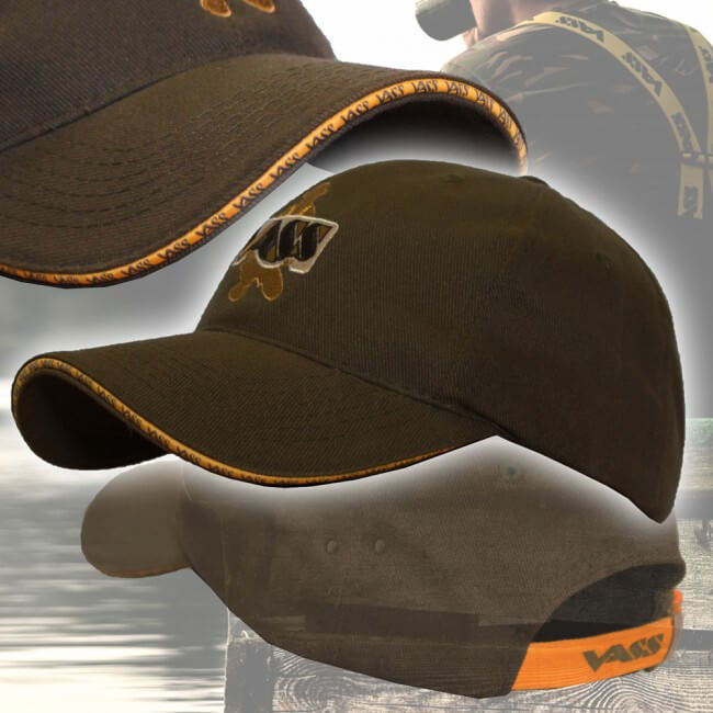 Gorra de la marca Vass modelo VH419 en color caqui con logotipo, especial para la pesca de carpfishing.