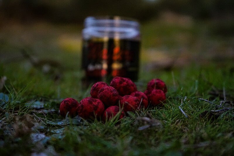 Boilies y Dumbells de la marca Pro Elite Baits gama Gold sabor Robin Red de 14 milímetros, especial para la pesca de carpfishing.
