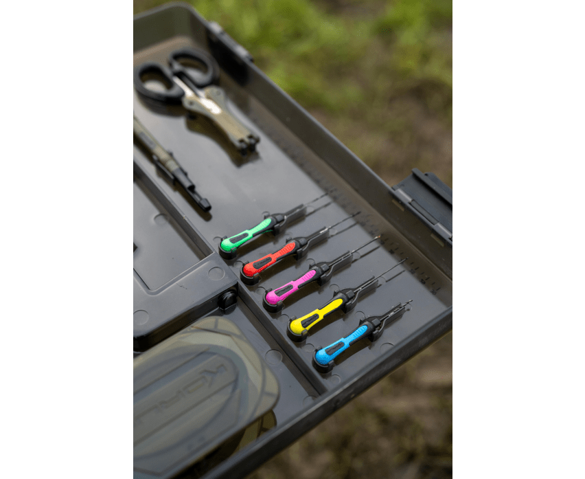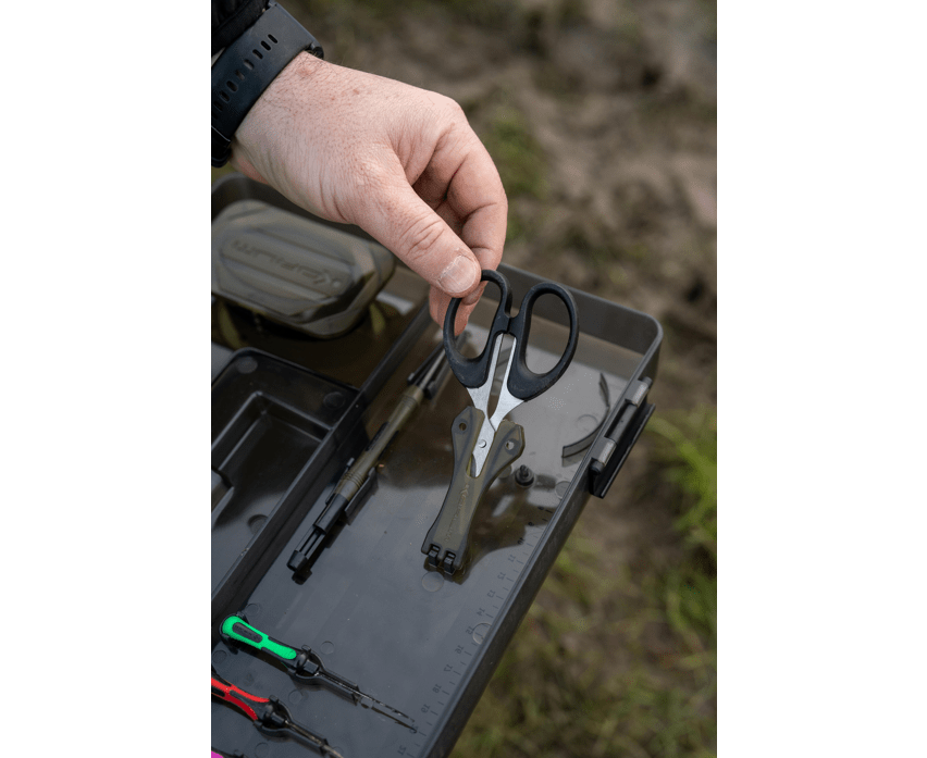 - Herramientas de cebado, desanzuelador y tijeras encajan perfectamente en sus ranuras dedicadas
