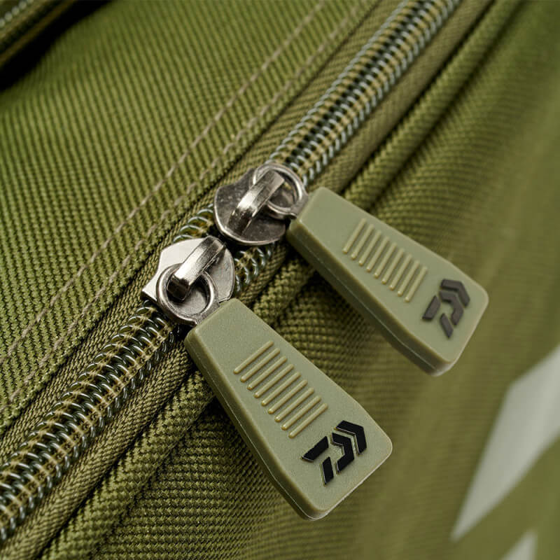 Macuto para accesorios de la marca Daiwa modelo Black Widow en color verde, especial para la pesca de carpfishing.