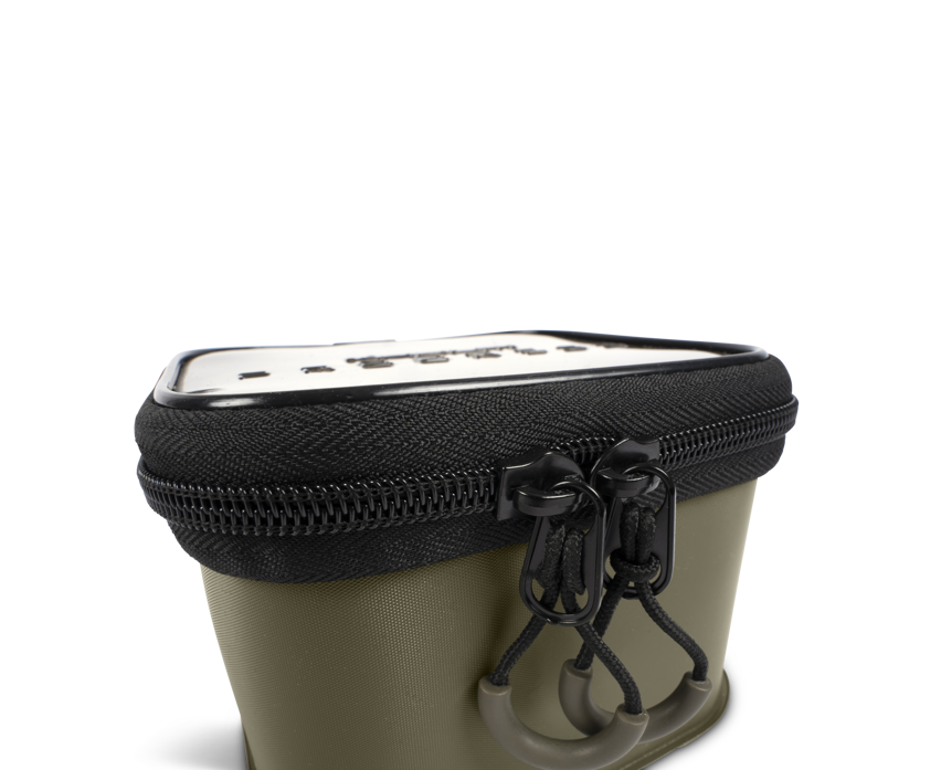 Macuto para botes de cebo de la marca Korum, modelo Progress Eva, en color verde, diseñado para el almacenamiento de cebos, dips y líquidos.