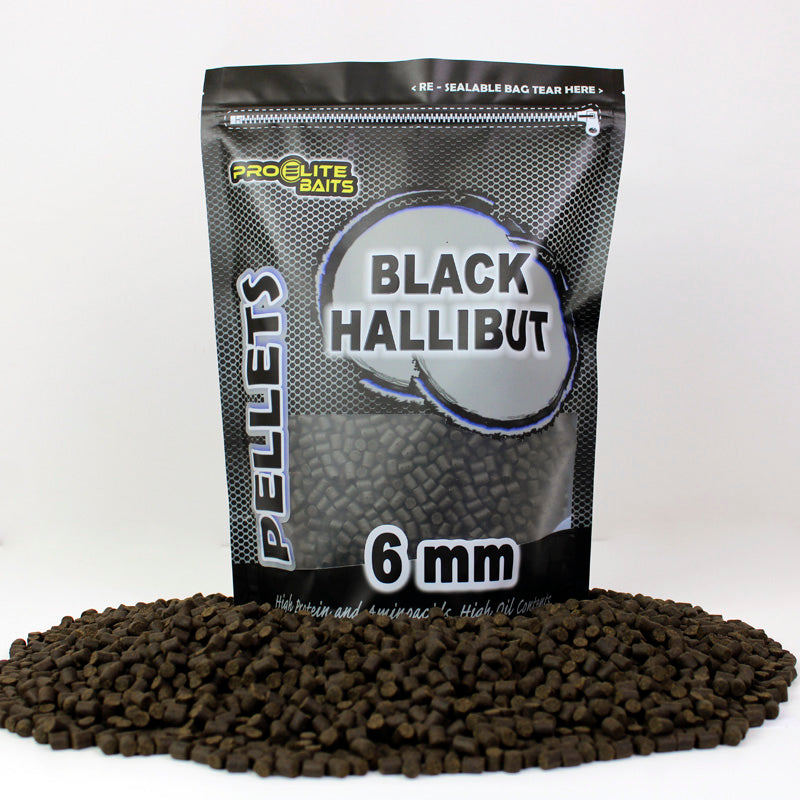 Micropellets Black de 6 milímetros de la marca Pro Elite Baits sabor Halibut en color negro, especiales para el cebado del carpfishing.