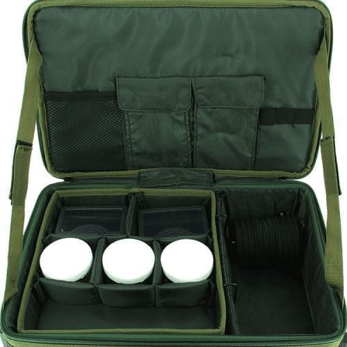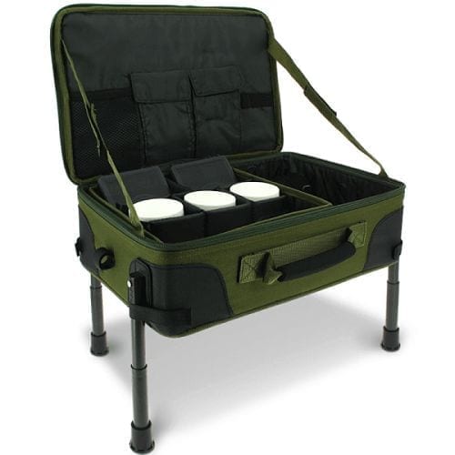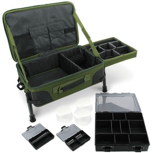 Estación de montaje con varios apartados de cierre con velcro. Cuenta con una bandeja lateral desmontable y tiene las patas ajustables. Su material lo hace resistente al agua.