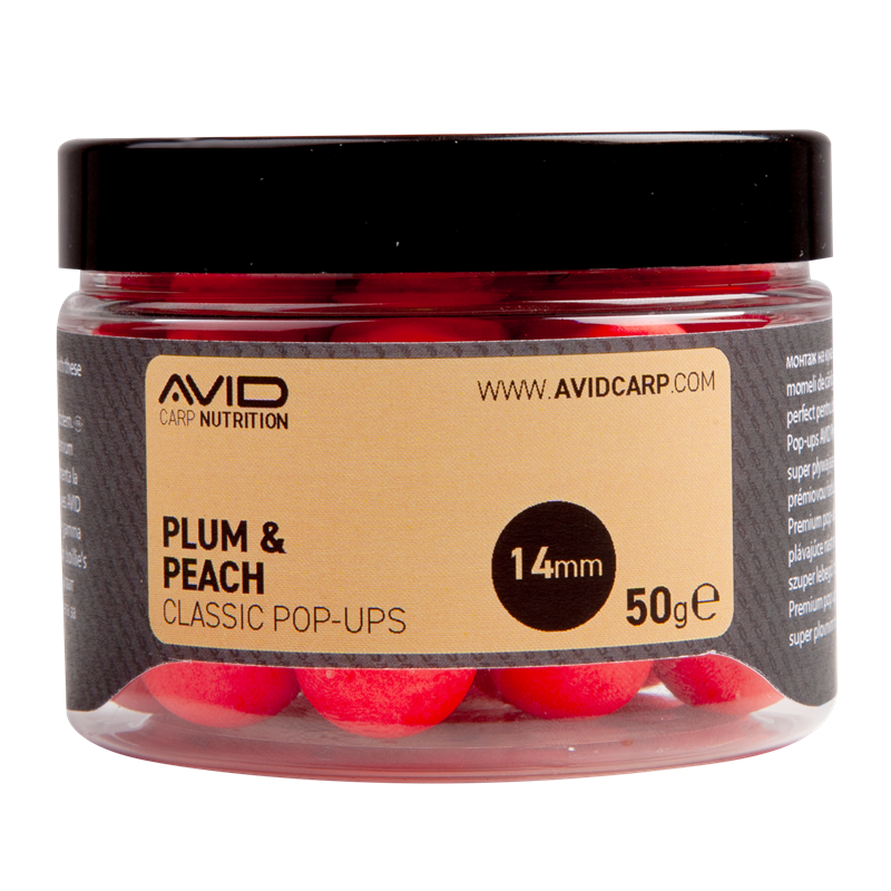 Pop Ups Flotantes de la marca Avid Carp, gama Classic, sabor Plum & Peach, especial para la pesca de carpfishing.