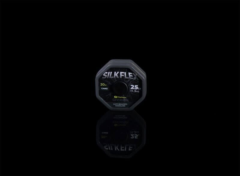Bobina de hilo trenzado de 20 metros con una resistencia de 25 libras de la marca Ridge Monkey, modelo SilkFlex Soft, en color camuflaje. Es una gran línea trenzada flexible especial para la pesca de carpfishing.